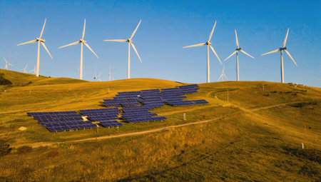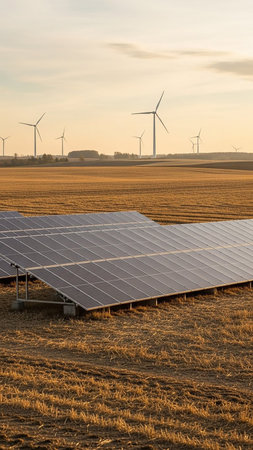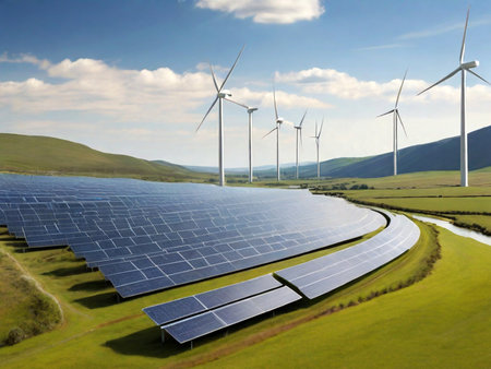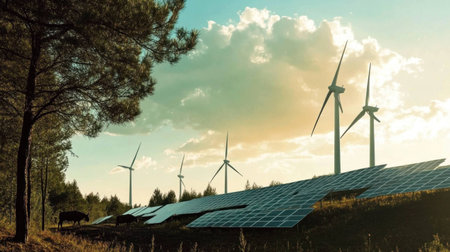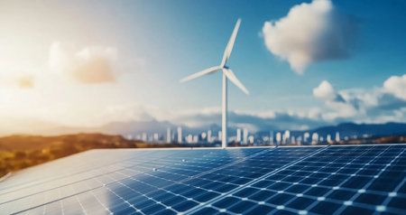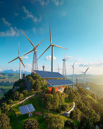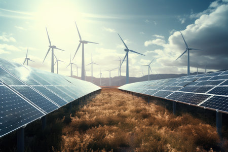 Promoting sustainable energy with solar panels and wind turbines in a vibrant landscape