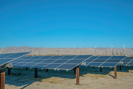 Wind farm with wind turbines and solar panels on a desert at California. There are solar panels at the front and a view of wind turbines and mountains against the sunset sky at the background.