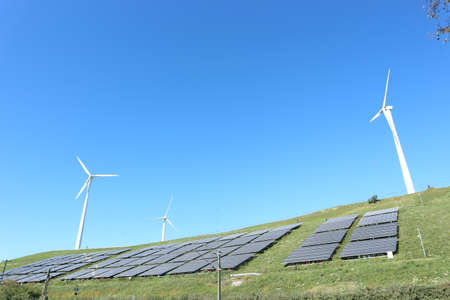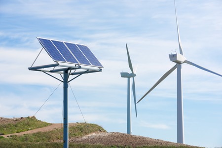 Solar energy panels and wind turbines on a green meadow with blue sky