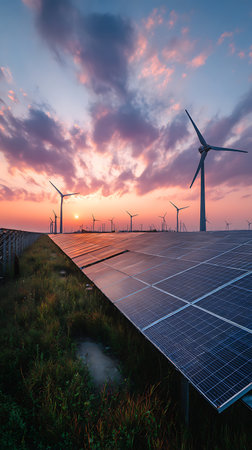 Sustainable energy landscape featuring solar panels and wind turbines under a vibrant sunset sky, symbolizing eco friendly technology and renewable energy