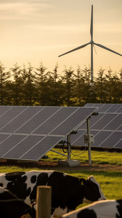 Grazing showing solar panels and wind turbine in a field with cows at sunset keywords: solar panels, wind turbine, renewable energy, sustainable, power, electricity, farm, field, cows, cattle,...