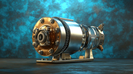 This image showcases a meticulously crafted metallic engine component, featuring an intricate design against a vibrant blue textured background, highlighting its industrial elegance.