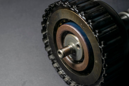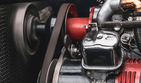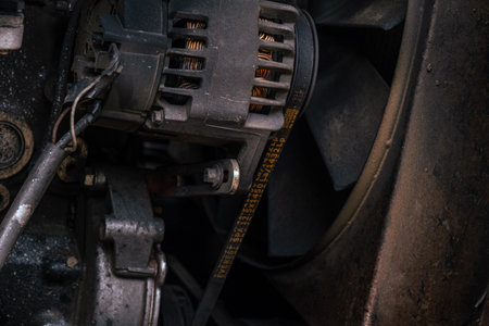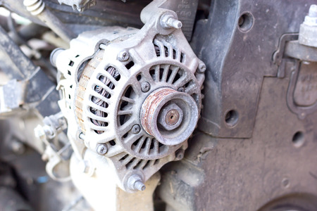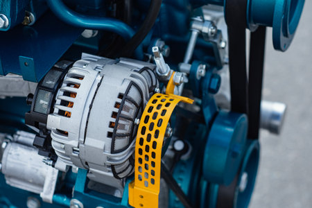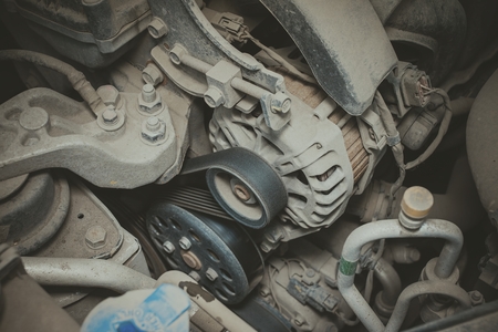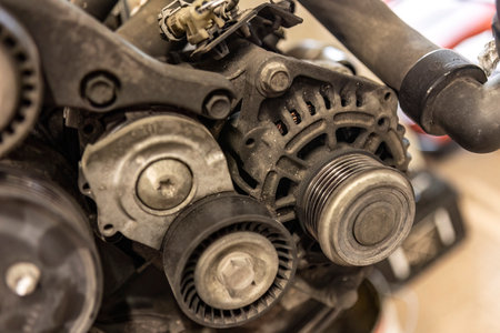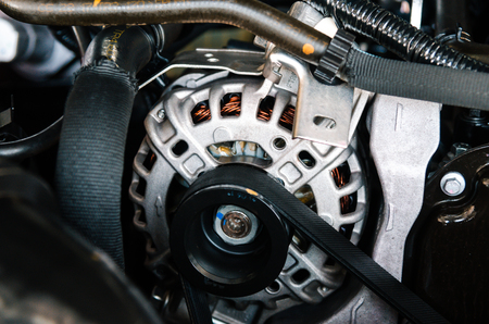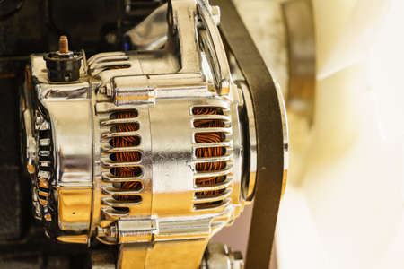 Close up of a car engine alternator with belt drive. Concept automotive machinery and mechanical parts for industry, engineering and repair
