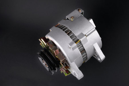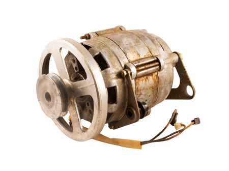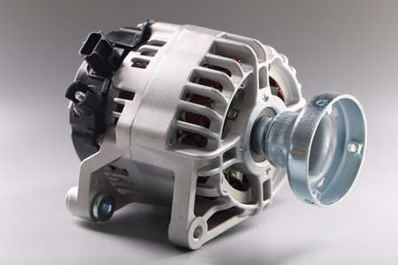 Car generator, car electrical network element on white background, generator details close-up. Spare auto parts for repair.