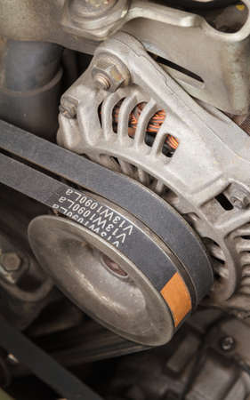 Close-up of the generator on an engine with a bypass belt is a part in the form of a rubber ring behind the plastic casing of the car and is the connecting link between the crankshaft and the camshaft