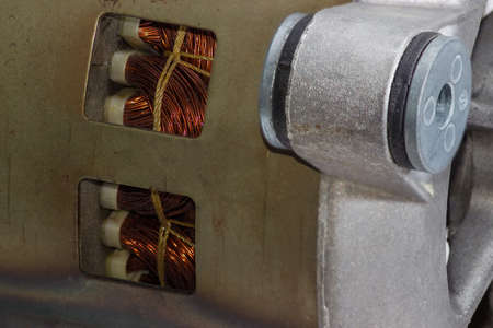 Fragment of electric motor with ventilation holes in the housing, through which can be seen windings and shock absorber motor mount on a foreground, close-up in selective focus