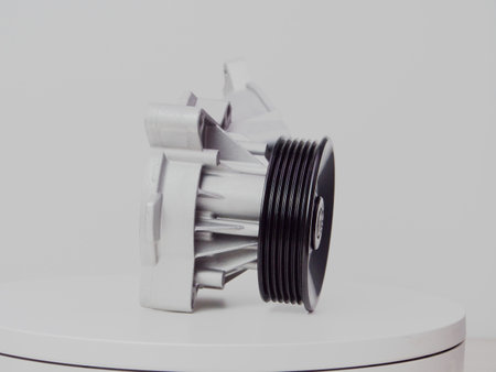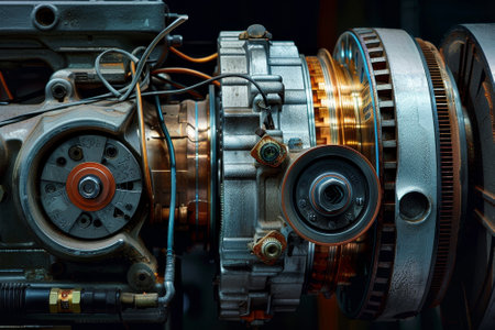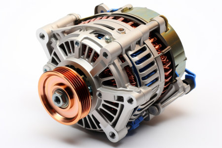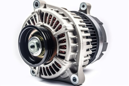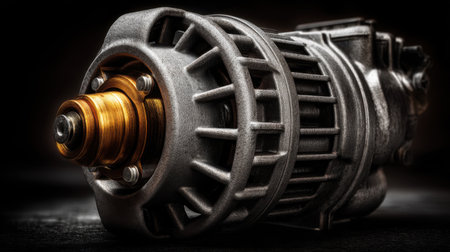 This high-resolution image features a close-up of an automotive alternator, showcasing intricate details and textures. Perfect for projects in engineering, automotive design, and machinery.