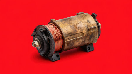 This stock photo showcases an electric motor component featuring exposed copper wire and signs of rust, set against a vibrant red background.