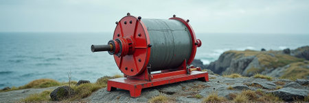 Red industrial winch on rocky coastline with ocean background. That the image is generated using AI.