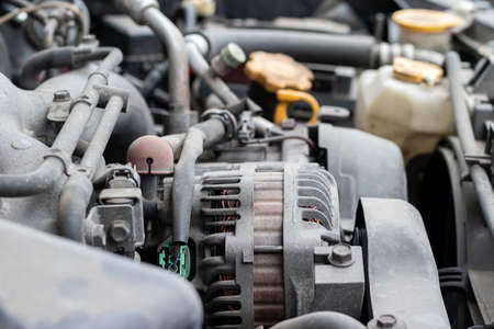 Alternator. Dusty details of a flat-four (boxer) car engine compartment under the open hood. Closeup side view
