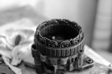 Old stator of an automobile generator. Repair of a used truck generator. Eye level shooting. Selective focus. Black and white photo