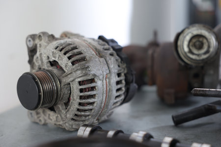 Used car generator on the table. Fully disassembled DC generator. Repair used generator. Auto repair shop or service center. Selective focus. Black and white photo
