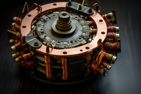 Close-up view of a vintage-style electric motor with intricate components, copper wiring, and textured surfaces.