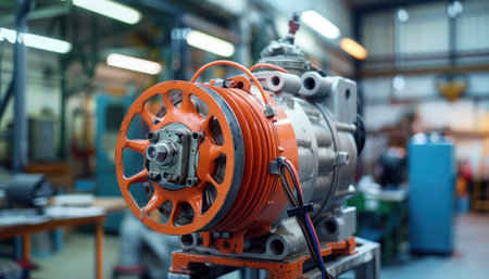 This striking image showcases a high-detail engine component with a stylish design. The black and silver contrast highlights its mechanics on a vibrant background.