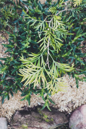 native Australian grevillea plant outdoor in sunny backyard shot at shallow depth of field