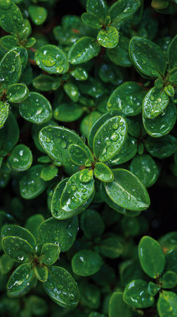 This captivating close-up image showcases fresh green leaves adorned with glistening water droplets, evoking a sense of tranquility and natural beauty.