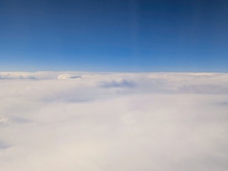 The beautiful cloudscape with clear blue sky. Panorama above white clouds as seen through window of an aircraft. A view from airplane window