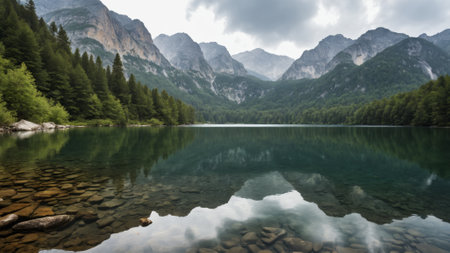A pristine lake nestled among majestic mountains, its calm waters mirror the surrounding peaks and cloudy sky, creating a tranquil atmosphere perfect for nature lovers and adventurers.