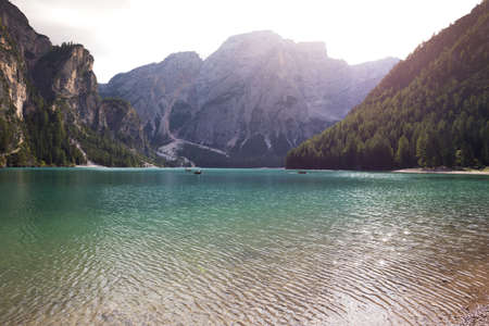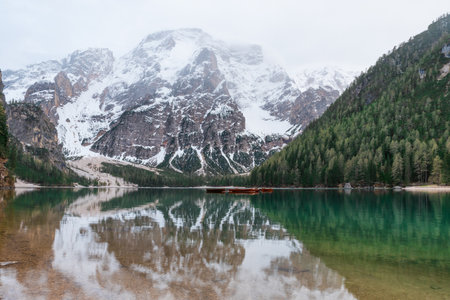 Lago di Braies with boats floating on turquoise water alpine lake in Dolomiti mountains, Belluno, Veneto, Italy with reflection on moody spring day. Lake in the forest in Dolomites in Italian Alps