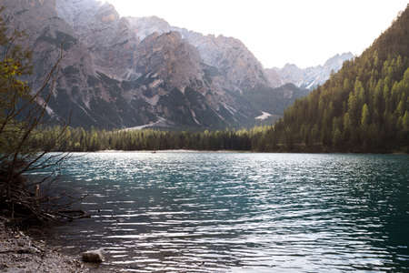 view of well-known tyrolean lake lago di Braies, Dolomites. Italy