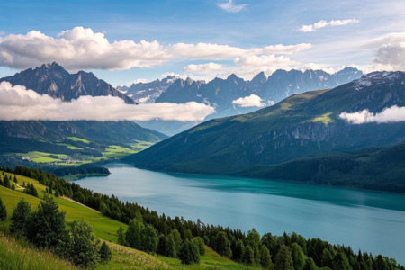 Tranquil picture of lakes and mountains, summer scenery of the Alps
