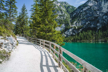Pragser Wildsee hiking path trail around lake. Dolomites, Italy