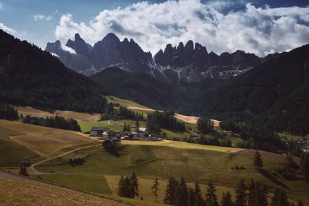 The landscape around Santa Magdalena Village. Located in Val di Funes, Dolomites area, Italy.