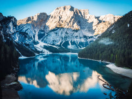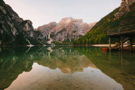 Reflection of the mountain in the water. Amazing view of Braies Lake (Lago di Baraies) in Alps, Italy.