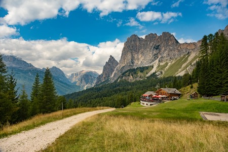 Mountain landscape in the Dolomites, Italy. Green meadows and mountains