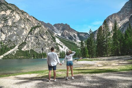 couple standing looking at lake in mountains. summer time