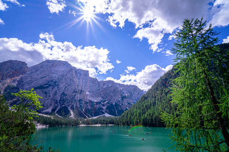 Turquoise lake in south tyrol, Braies in the Dolomites.