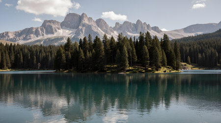 Lago di Carezza Karersee with Alps and blue skies, Südtirol, Italy