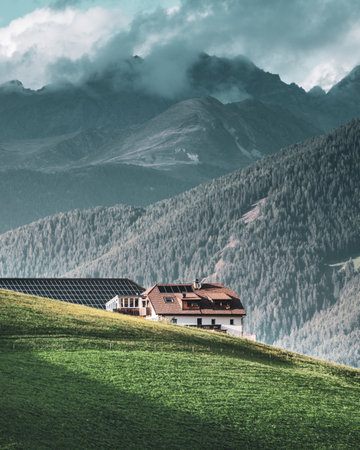 Idyllic Alps landscape with green forest on rocky mountain under beautiful sky