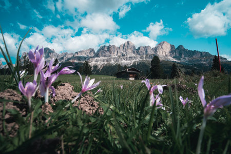 Amazing view on Seceda peak. Trentino Alto Adige, Dolomites Alps, South Tyrol, Italy, Europe. Odle mountain range, Val Gardena. Majestic Furchetta peak. Purple flowers in the morning sunlight.