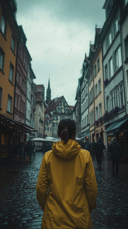 A person wearing a yellow jacket stands on a balcony overlooking vibrant buildings while exploring the historic district. The cloudy sky creates a moody atmosphere.