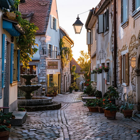 A picturesque narrow cobblestone street lined with colorful flower pots creates a charming atmosphere in a quaint European village. Bright blooms decorate the walls and pathways.