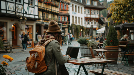tourist walking on a cobblestone street with historic buildings on both sides generative ai