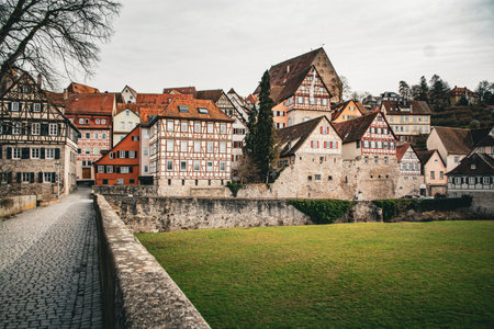 Gothic half-timbered houses - picturesque view in the Schwabisch Hall city Old town, Germany