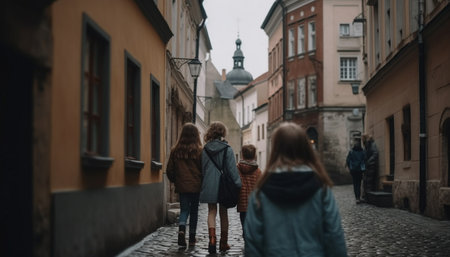 Young adults walking in city, admiring architecture and famous places generated by artificial intelligence