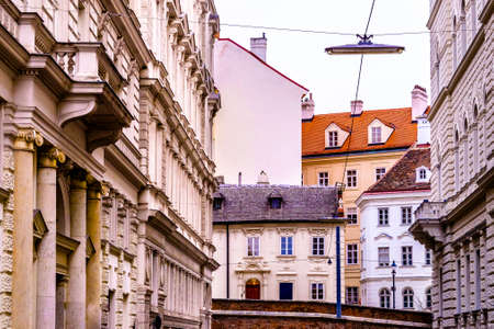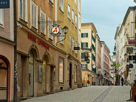 Salzburg, Austria, 28 August 2021: Narrow picturesque street with colorful buildings in historic center in medieval city, renaissance and baroque houses, Facade of stone building at hagenauerplatz