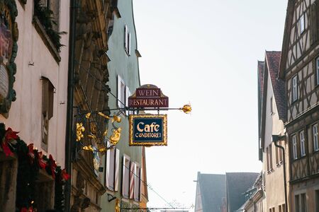 Germany, Rothenburg ob der Tauber, December 30, 2018: Authentic signs of a wine restaurant and pastry shop cafe on the facade of the house.