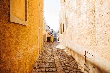 Bad Kissingen/Germany-31/12/18: an empty narrow street in Bad Kissingen downtown, Bavarian region, Germany. Bad Kissingen is one of Germany's best-known health resorts