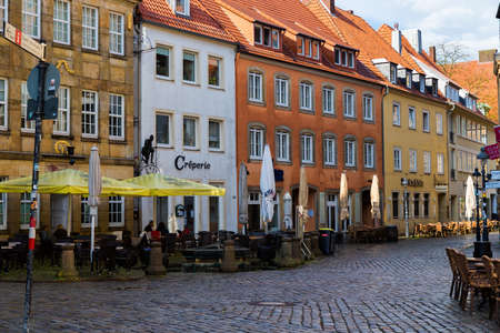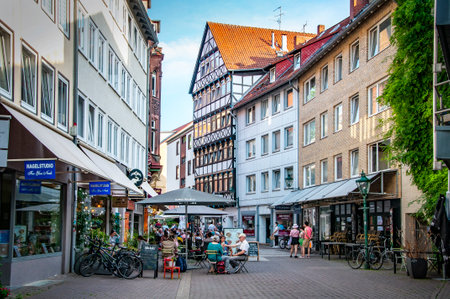 HANNOVER, GERMANY. JUNE 19, 2021. Beautiful view on small street. Buildings in fachwerk style, prussian wall.