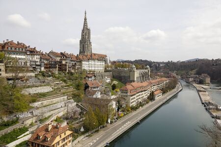 Bern Switzerland - April 16, 2018: Due to its historical character, the capital of Switzerland is a popular destination for many tourists. View of Bern and the cathedral tower over the city.