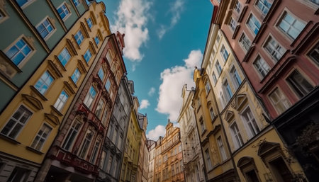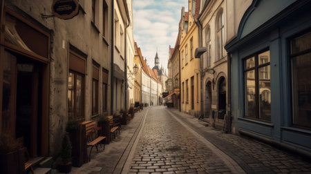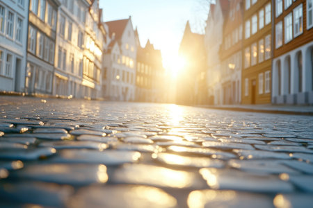 European cobblestone street with historic buildings, bicycle POV, perfect for travel agency and tours. Old town architecture, traditional buildings, clear blue sky, serene atmosphere.