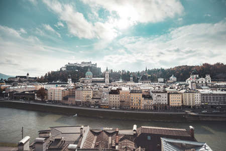 Salzburg historic district at autumn time, colorful leaves and colors with sunshine, Austria