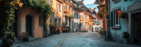 A beautiful spring day in Switzerland showcases a cobblestone street lined with colorful houses and vibrant blossoms.