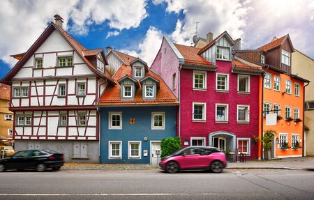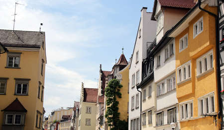 Lindau, old town on Lake Constance (Bodensee), Bavaria, Germany. Motley colorful traditional german bavarian houses along street with cars. Day cityscape with architecture blue sky and clouds.