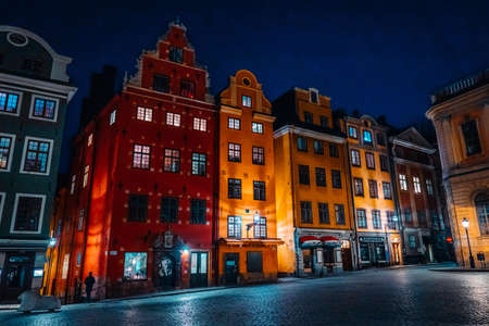 14 February 2020, Stockholm Sweden. Gamla Stan - Old town. Colorful houses at night. Beautiful european facade of historic buildings.