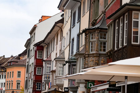 Schaffhausen, Switzerland - October 21, 2023: Beautiful facades of historic houses at the old town of Swiss City of Schaffhausen on a foggy day at Schaffhausen, Switzerland on October 21, 2023